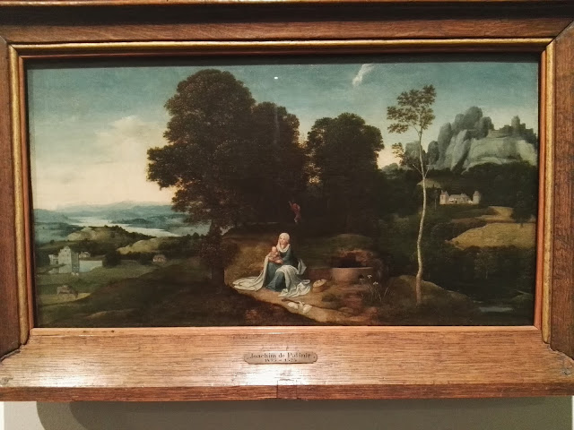 | JOACHIM PATINIR. Paisaje con el descanso en la huida a Egipto. Óleo sobre tabla. 1518-1524. Museo Thyssen-Bornemisza, Madrid. |